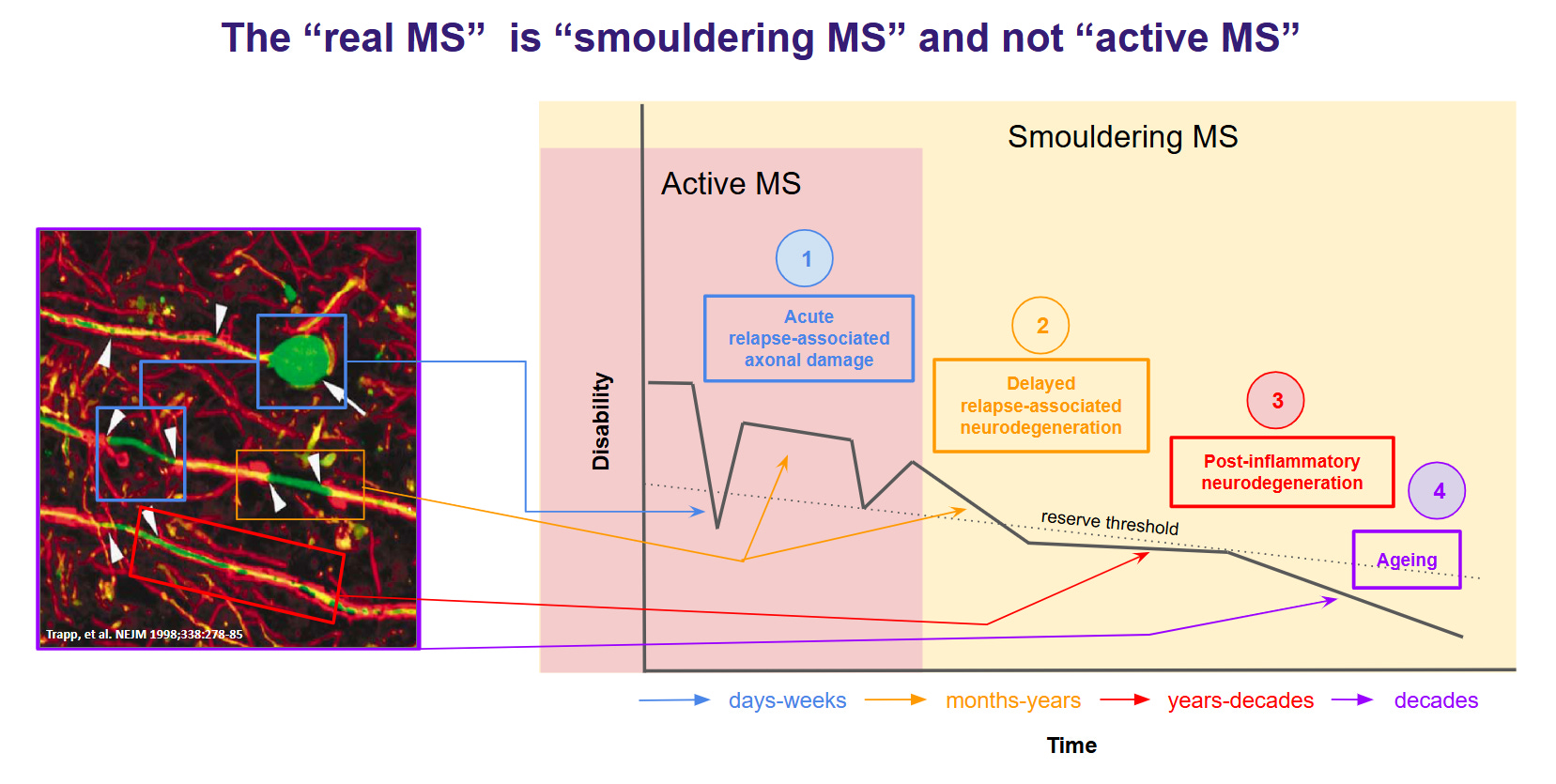 An essential aspect of clinical outcomes and various biomarkers in MS is that they evolve at different rates. In other words, the temporal sequence of how they change over time is out of sequence with each other. I have referred to this phenomenon in the past as lag. Let me give you some examples. Demyelination develops along a specific pathway before loss of function and before a Gd-enhancing lesion is seen. Changes in the magnetisation transfer ratio (MTR) on MRI can occur in normal-appearing white matter (NAWM) several months before an MS lesion becomes visible with Gd-enhancement. This indicates that MTR changes are earlier and more sensitive markers of pre-lesional tissue damage than Gd enhancement. At some point, axonal injury occurs, leading to NFL release. Based on serial sampling studies, we suspect this process may precede the onset of clinical relapse symptoms and the detection of Gd enhancement on MRI. However, these latter processes are likely to cluster into a relatively narrow window that lasts days to weeks. We know that Gd enhancement of a lesion typically lasts 2-3 weeks before resolving, whereas NFL levels remain elevated for months. The latter occurs because of Wallerian degeneration, which takes a long time to unfold: it can take months to clear the debris from transected axons. The proximal axonal degeneration above the lesion may take even longer and play out over years. Similarly, repaired or remyelinated axons may be programmed to die off in the future. We think they are vulnerable to early ageing, energy failure and delayed excitotoxicity. This delayed neurodegeneration may happen over decades. I try to illustrate these time changes in this cartoon that I made more than a decade ago.