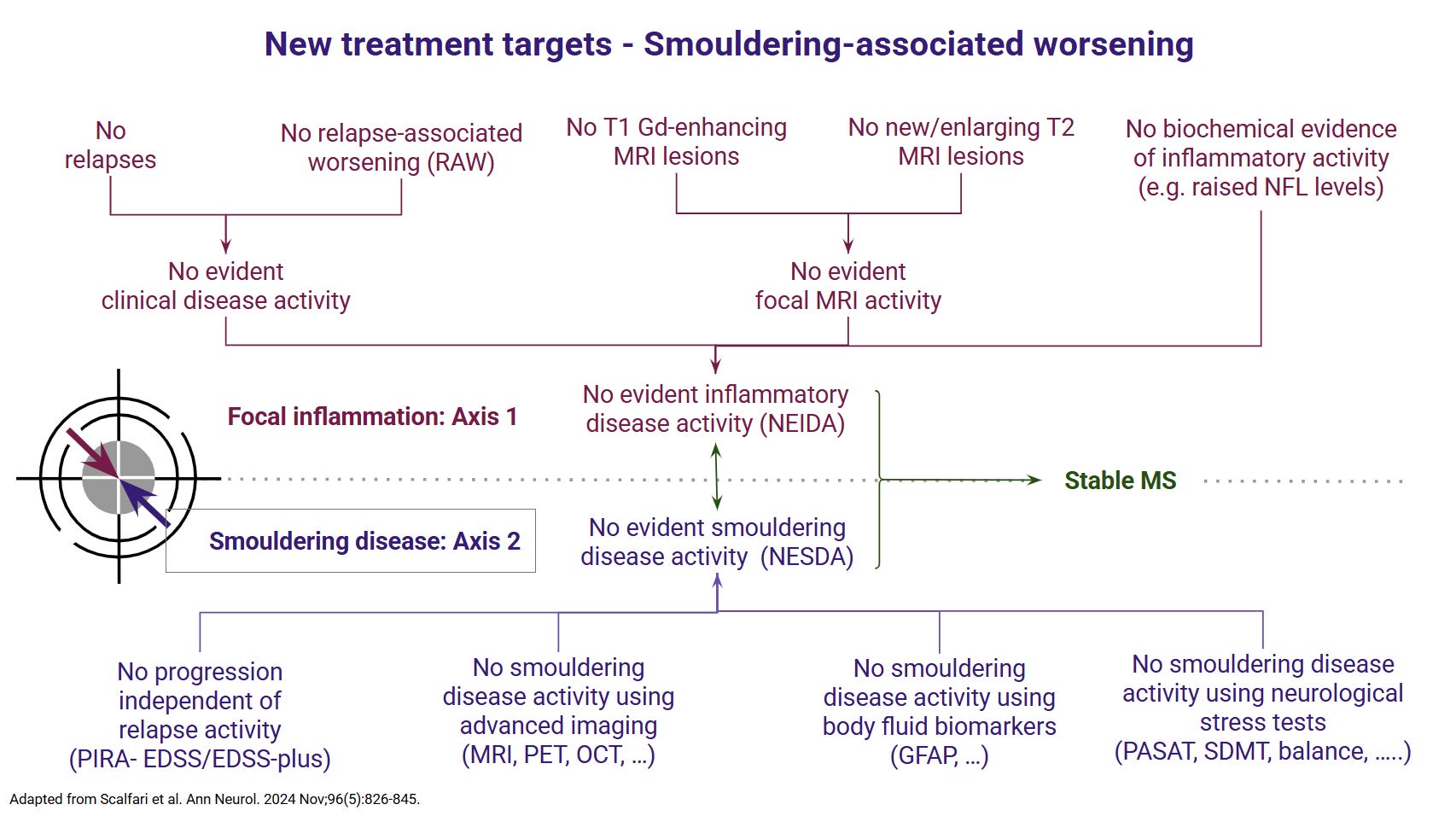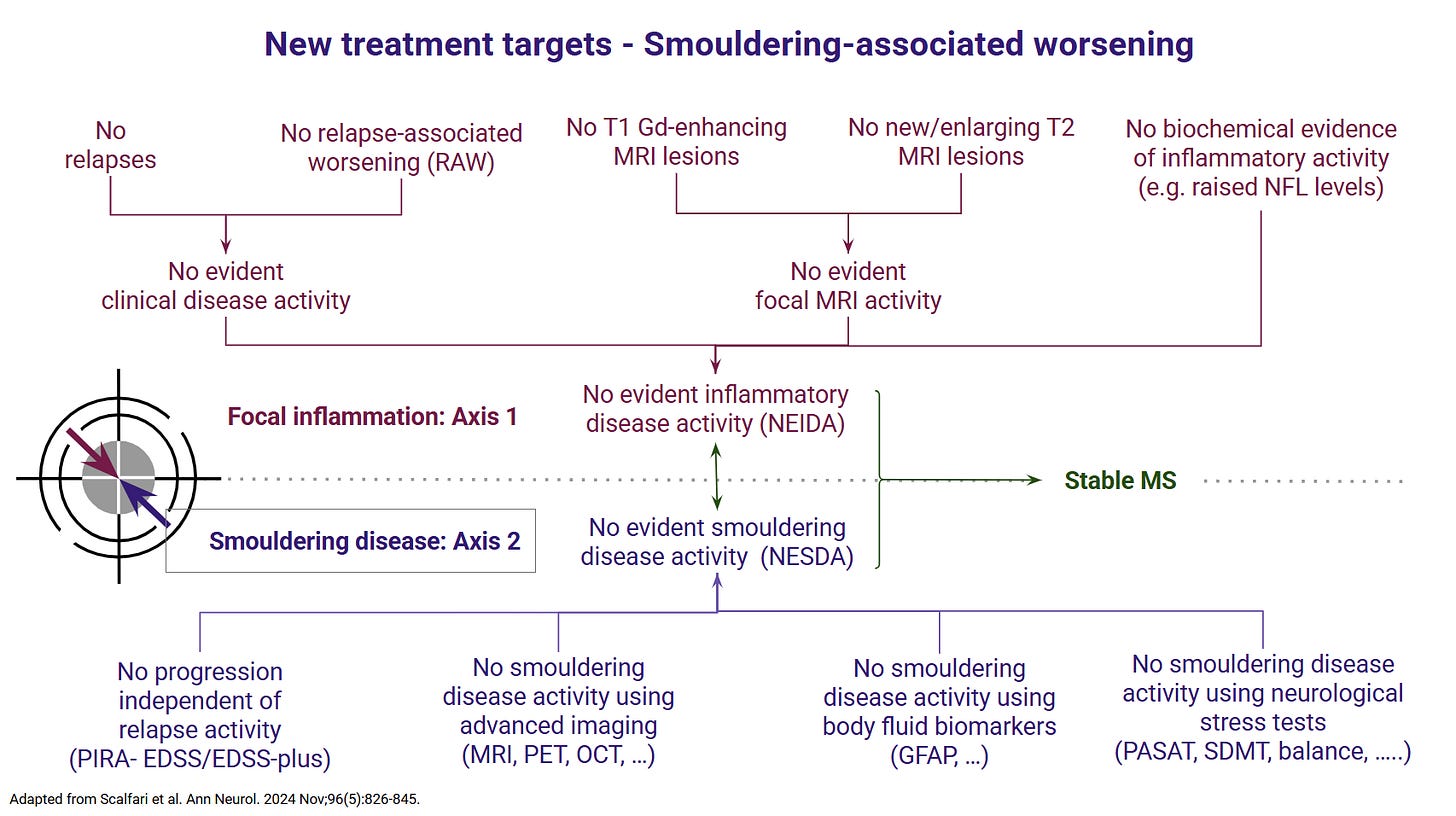 A crucial point made by the authors in the discussion is that few centres have the infrastructure to reliably analyse the scans and generate the metrics required as inputs into this model. Therefore, it isn't easy to see how this model will impact precision medicine. In comparison, sNFL and CSF NFL levels are beginning to enter routine clinical practice and are increasingly being used to aid in clinical decision-making. To be blunt, I am not sure how this paper changes my thinking about MS and its management. Our therapeutic strategies remain the same: early, effective treatment is the best way to protect the end organ. Our treatment targets remain no evident inflammatory disease activity (NEIDA) and no evident smouldering disease activity (NESDA), regardless of what proposed subtype of MS you have. We have very effective treatments for NEIDA and less effective treatments for NESDA; it would take a brave neurologist not to treat a person with a low-sNFL phenotype with an anti-inflammatory. Similarly, it would not make sense to ignore smouldering MS in a person with a high sNFL phenotype. The challenge from now on for the MS community is developing treatments for smouldering MS to achieve stable MS and long-term remission regardless of putative subtypes.