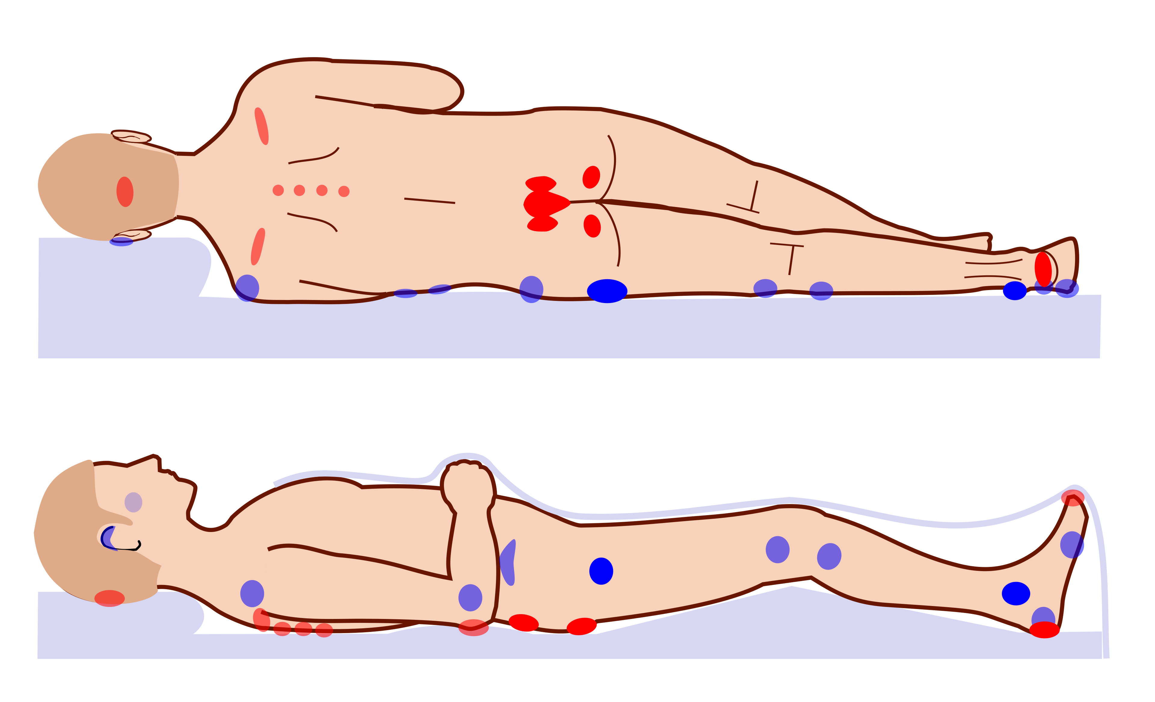 Pressure ulcers remain a devastating clinical challenge encountered in the management of people with advanced MS. Pressure ulcers, pressure sores, bedsores, decubitus ulcers, or pressure injuries, are localised areas of cellular necrosis and tissue damage occurring in the skin and underlying soft tissues. They almost exclusively develop over bony prominences such as the sacrum, ischial tuberosities (hips), heels, and occiput (back of head). The following image from Wikipedia illustrates the most common sites for pressure ulcers.