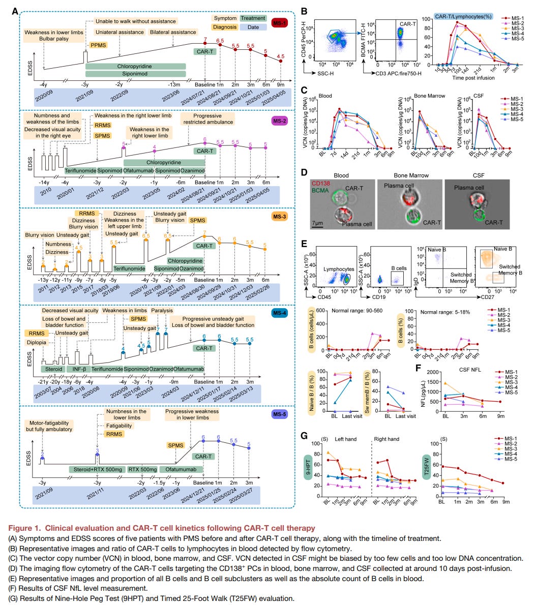 I sincerely hope this one swallow is not the end of this story. I don’t think so. This patient is one of five patients in the small case series below. This study reports the results of the first-in-human study of anti-B-cell maturation antigen (BCMA) chimeric antigen receptor T (CAR-T) cell therapy in patients with progressive MS (PMS).